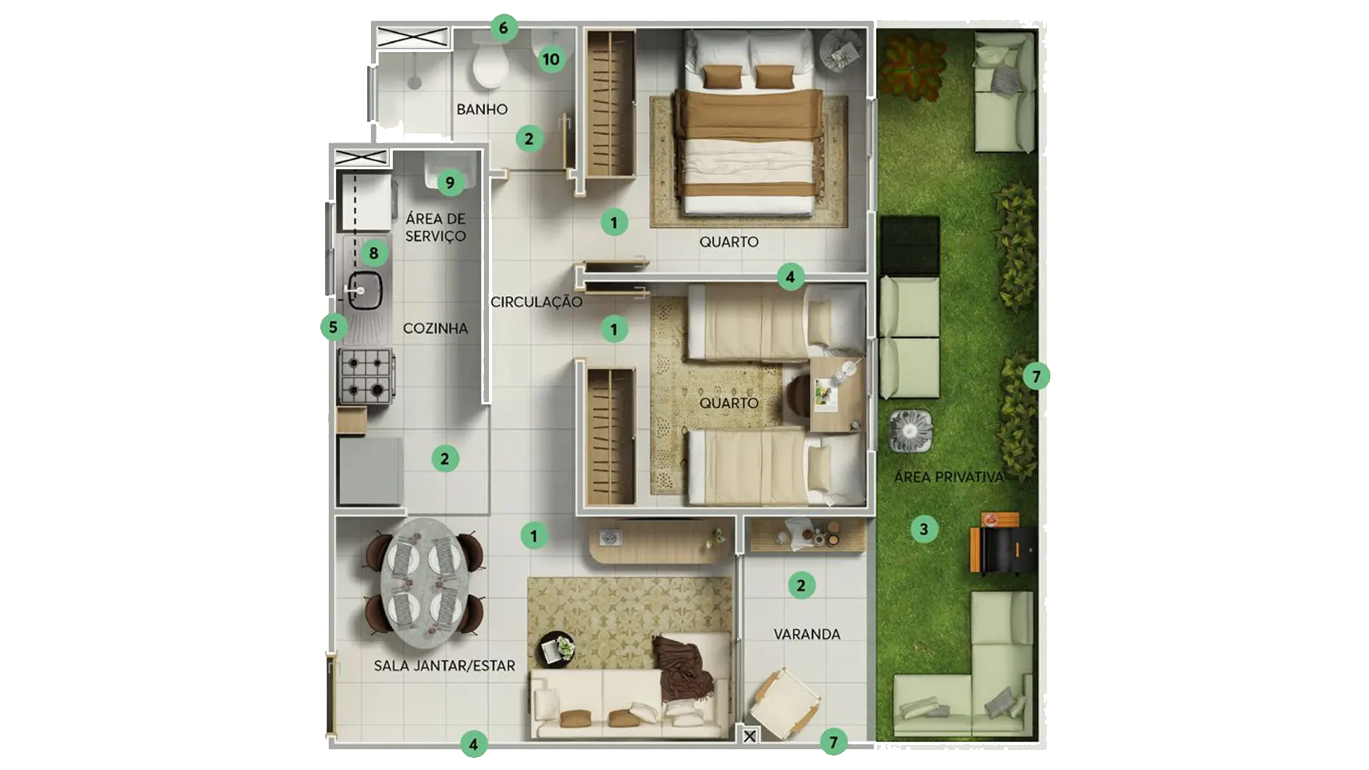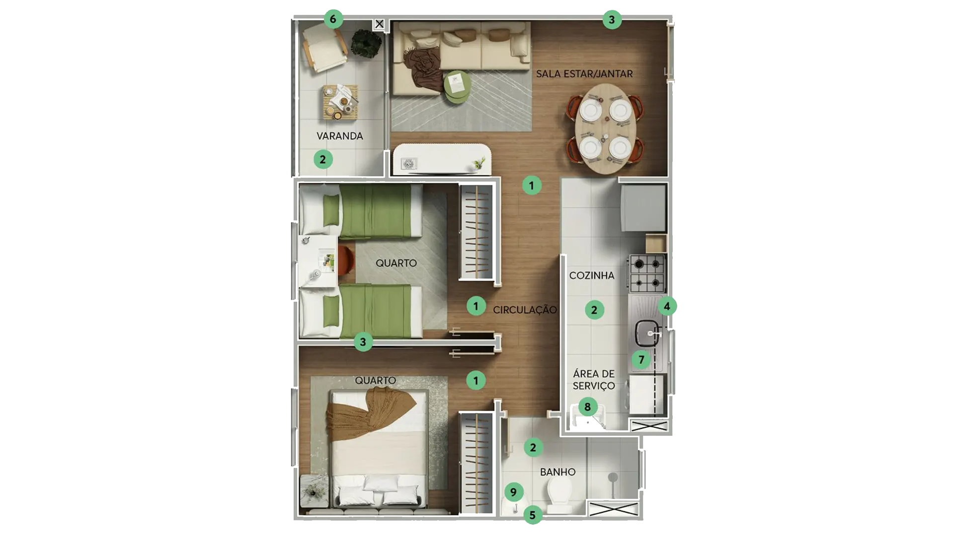Os apartamentos de 2 quartos contam com opção de varanda, que amplia sua experiência de lar e conecta você com o ambiente ao redor, oferecendo um refúgio de tranquilidade no fim do dia.